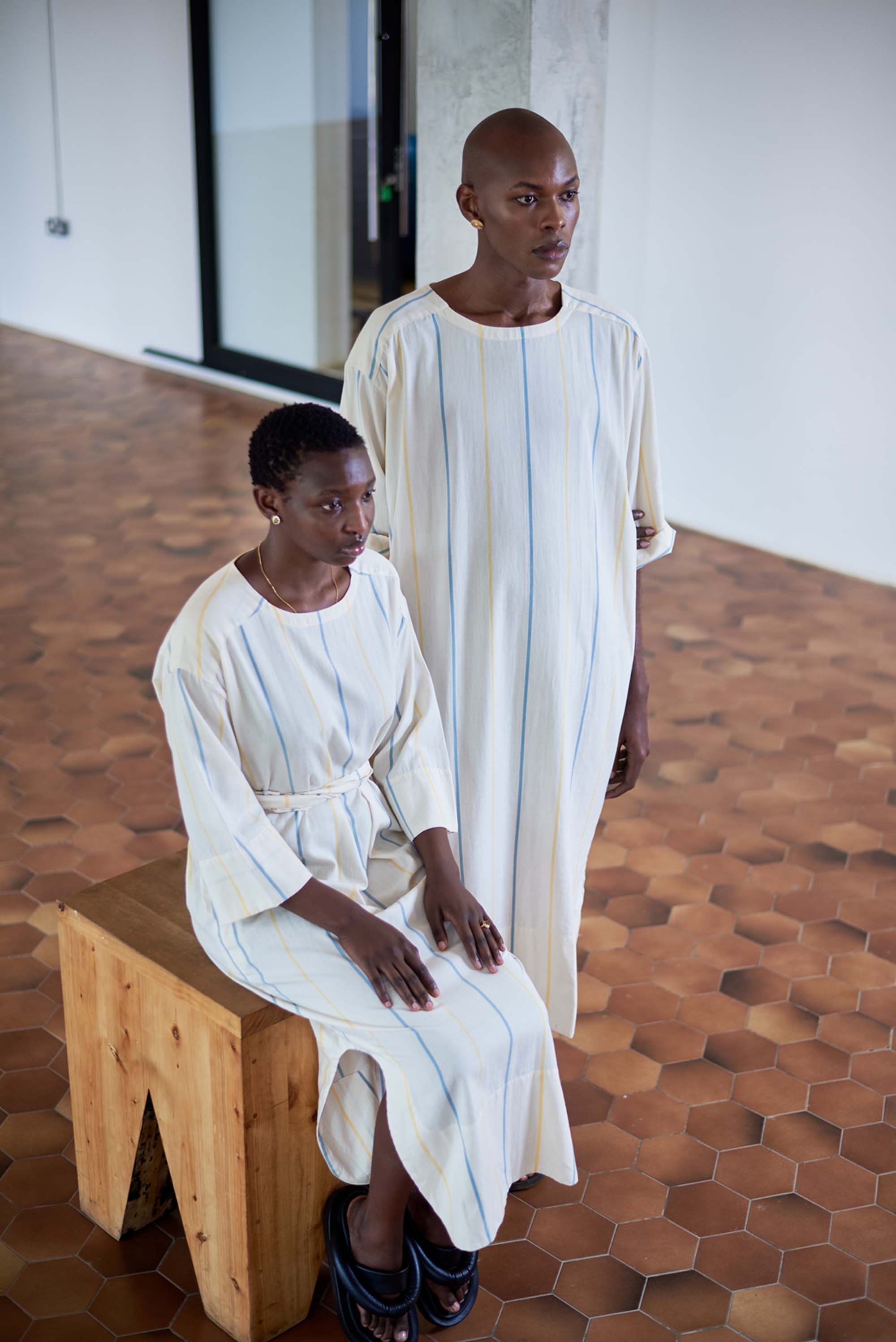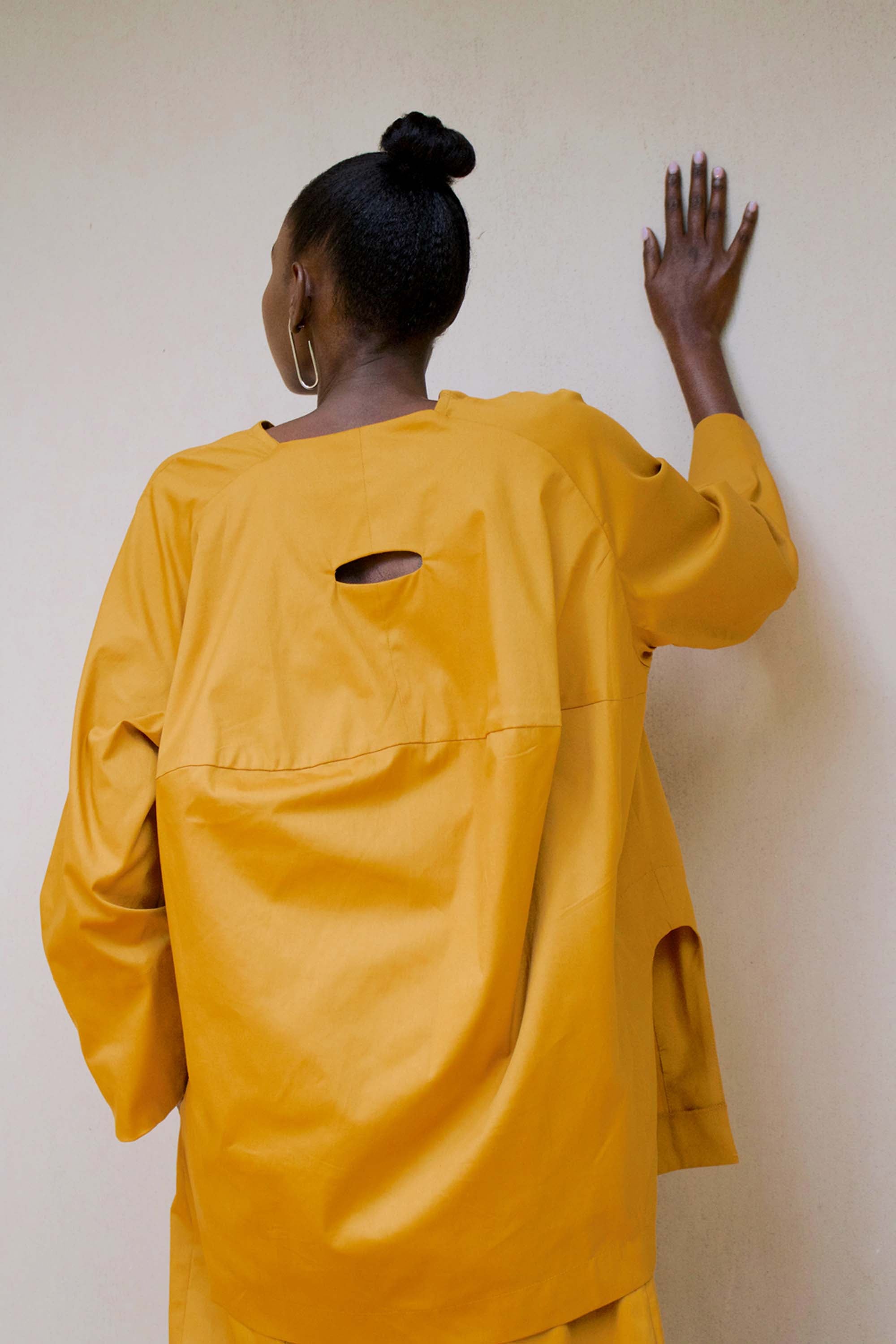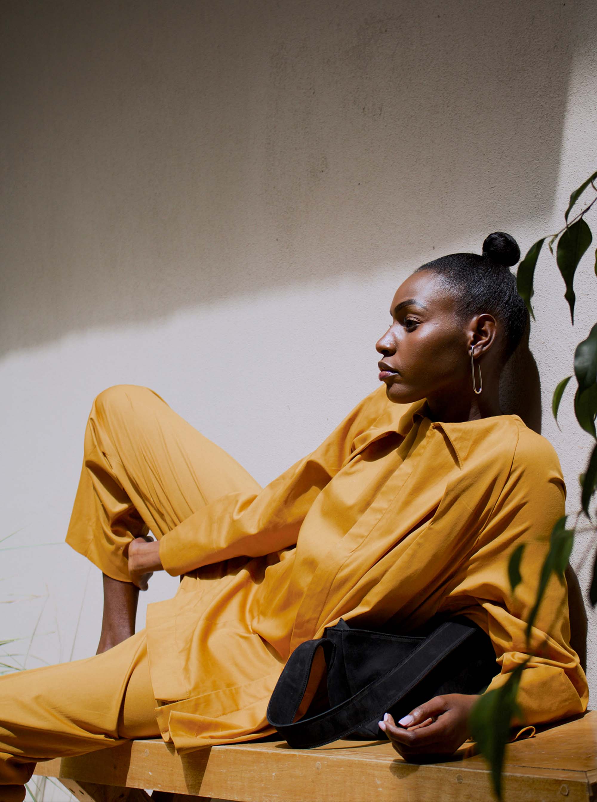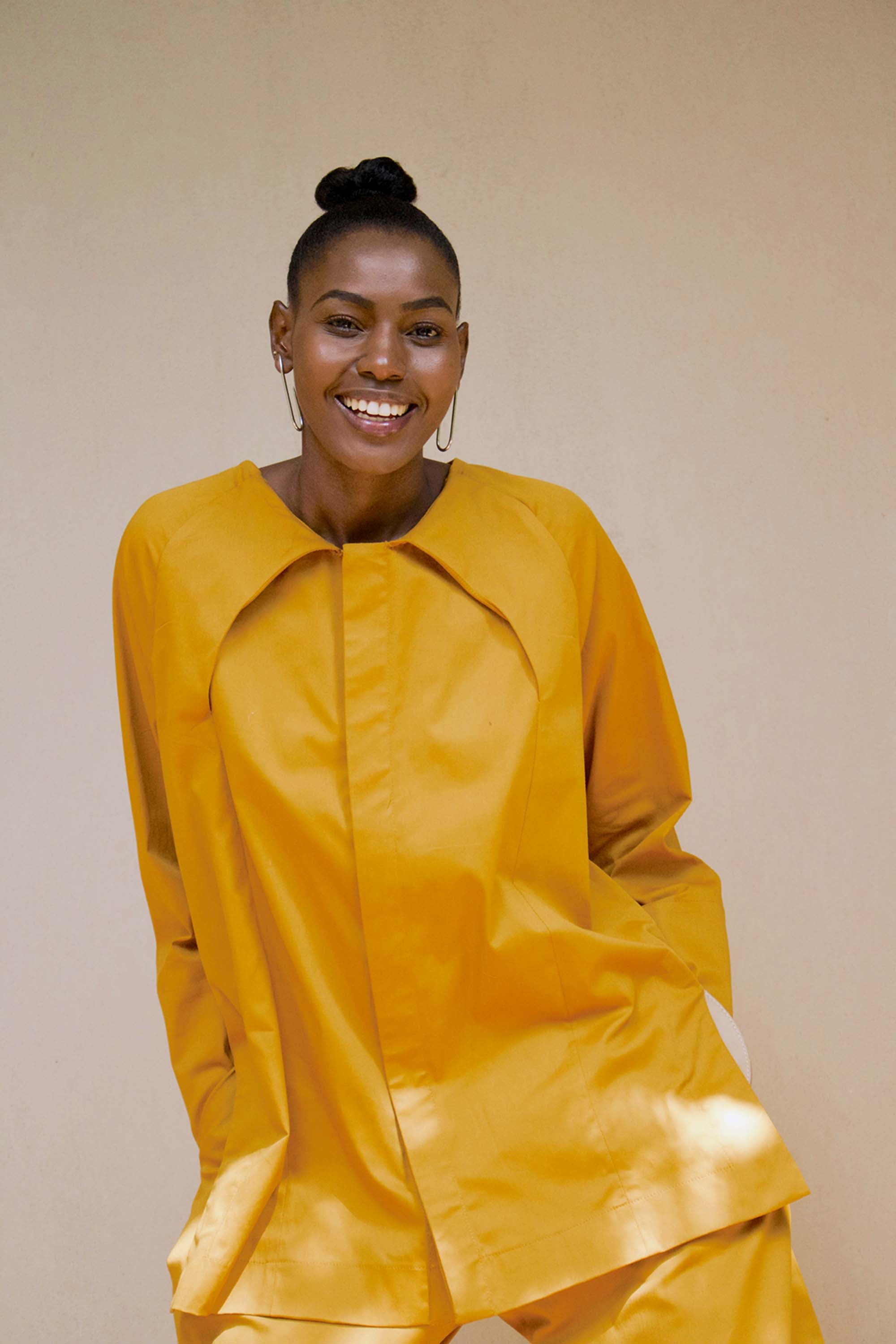 Our SS23 collection "Versatile Essentials" focuses on timeless silhouettes with architectural details. Featuring pieces in vibrant yellows and deep navy blues, these pieces blend structural elements with fluid draping, celebrating the duality of strength and softness in African design.