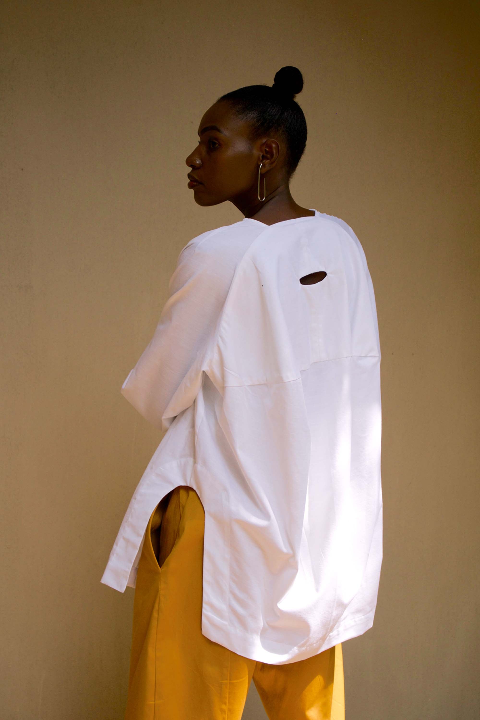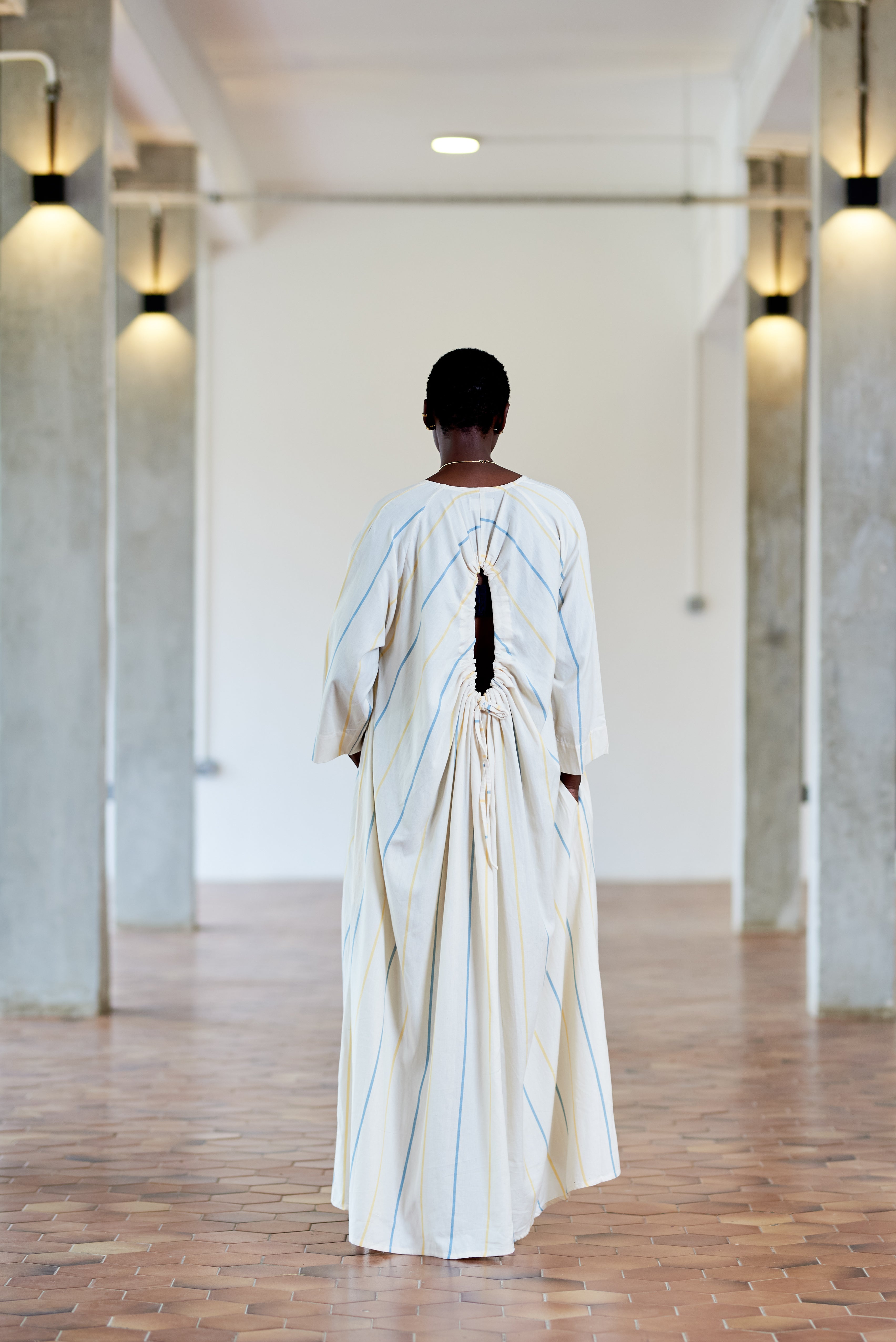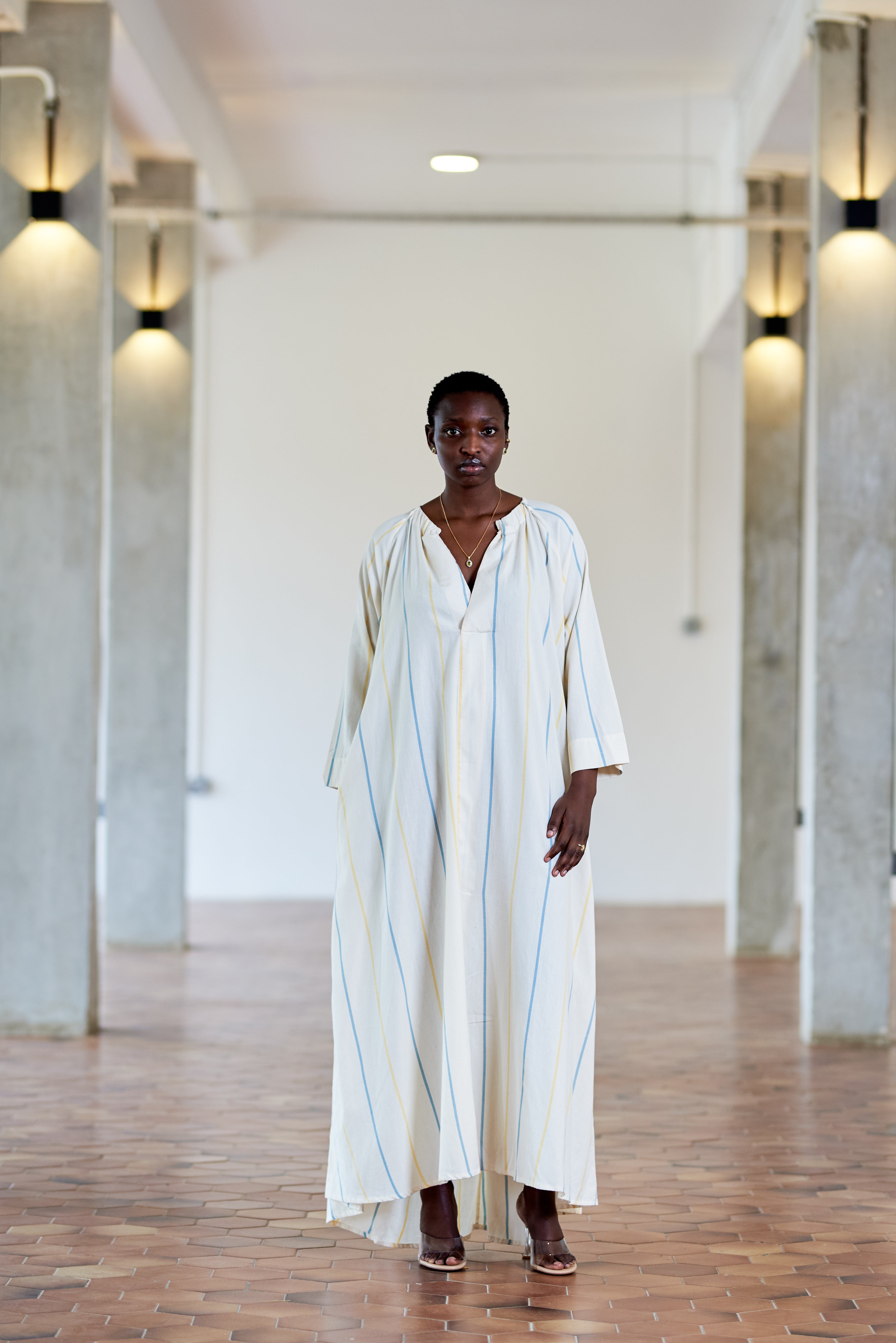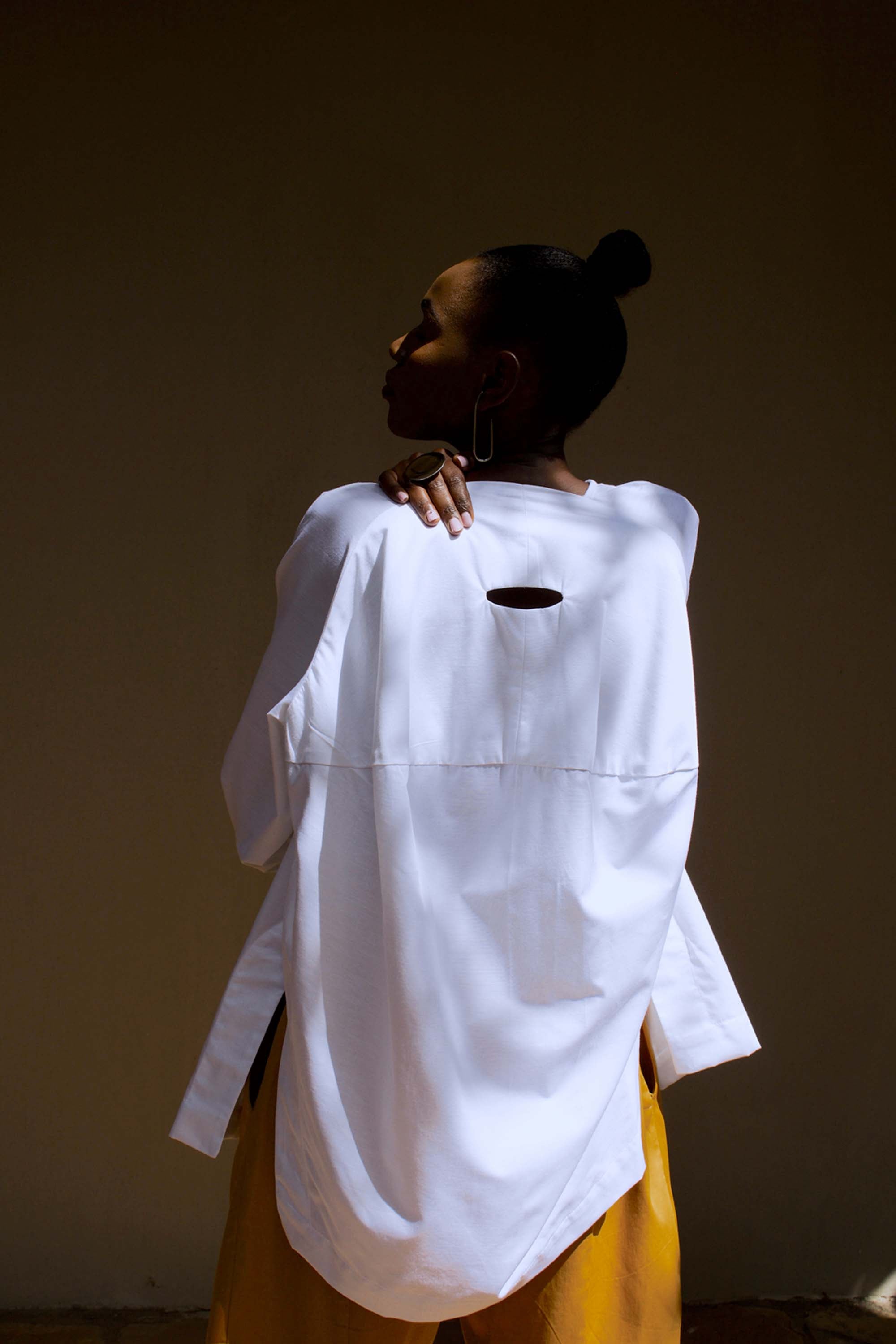 Our SS23 collection "Versatile Essentials" focuses on timeless silhouettes with architectural details. Featuring pieces in vibrant yellows and deep navy blues, these pieces blend structural elements with fluid draping, celebrating the duality of strength and softness in African design.